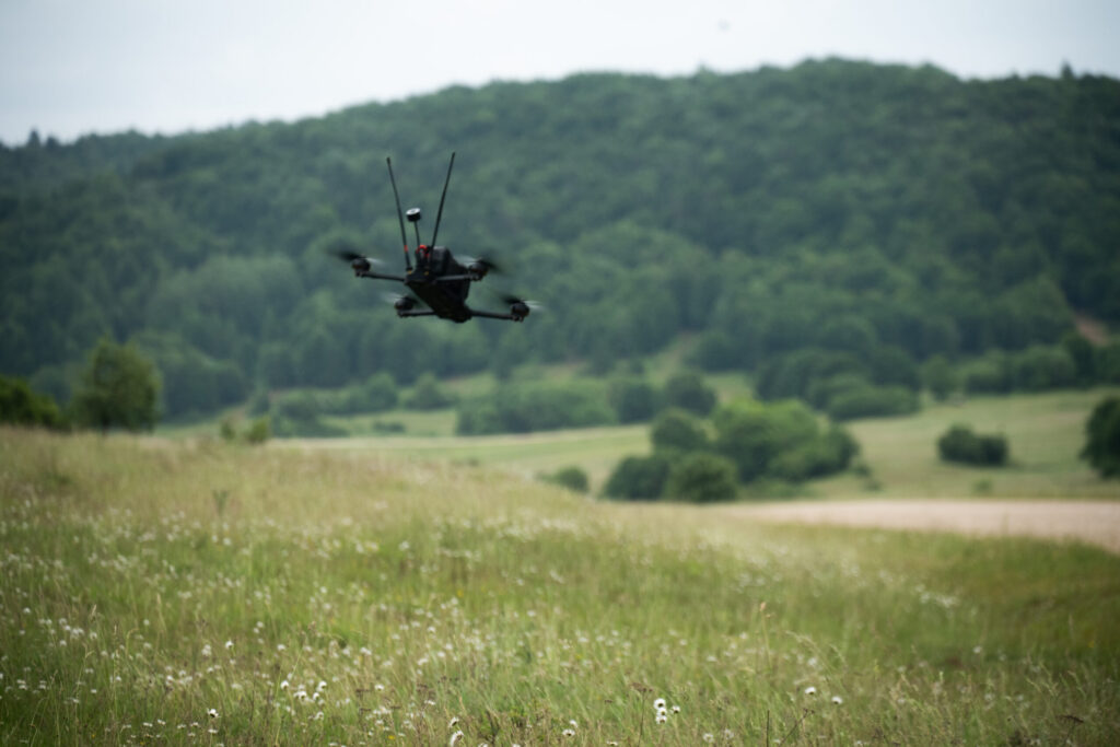 A British operated Nero Archer drone flies towards a target in Germany. Image: Spc. Elijah MagaƱa, U.S. Department of Defense